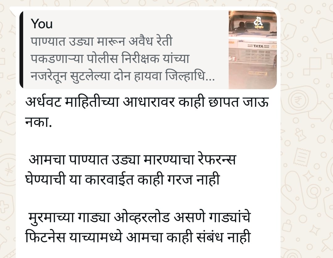 त्या वृत्ताचा पोलिस निरीक्षक चिंचोलकर यांचा खुलासा व त्यास उत्तर नांदेड – जिल्हाधिकारी कर्डिले यांनी विना नंबरच्या हायवा पकडली हे वृत्त प्रकाशित करताना सम्यक ने पाण्यामध्ये उड्या मारून अवैध रेती पकडल्याची आठवण करून त्यांना ह...