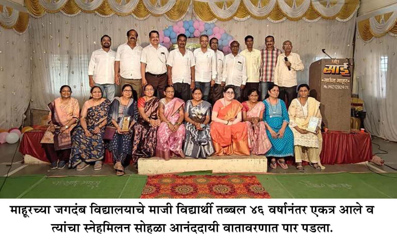माहूरच्या जगदंब हायस्कूल येथे १९७८-७९ या वर्षात शिकत असलेले माजी विद्यार्थी, सोशल मिडीया, व्हॉटसअॅप, फेसबुकच्या माध्यमातून गेल्या सहा महिन्यापासून एकमेकांना शोधत होते. या माध्यमांचा कसा चांगल्या प्रकारे वापर होऊ शकतो. याचे उदाहरण त्यांनी देत तब्बल ४६ वर्षानंतर हे सर्व विद्यार्थी एकत्र आले. प्रामुख्याने राजश्री फलटणकर यांनी वेळोवेळी केलेले मार्गदर्शन, माजी विद्यार्थी प्रकाश जगत आणि संजय रामकृष्णराव कुलकर्णी यांनी निर्माण केलेली सकारात्मक उर्जा आणि सर्वांना एकत्र करण्याची नियोजनबध्दतता यामुळे तब्बल ४६ वर्षानंतर हे माजी विद्यार्थी एकत्र आले. सुधीर देव यांचे उत्कृष्ट नियोजन तसेच किरण तळेगावकर आणि विजय भोपी यांच्या सहकार्याने हे स्नेहमिलन पार पडले. इतक्या वर्षानंतर हे सर्व मित्र एकत्र आल्याने सर्वांच्या चेहर्यावर आनंदाश्रू दिसून येत होते. शंकर राठोड, प्रदीप कान्नव, विजय कोरडकर, भारत बेहेरे, राजेंद्र देशमुख, जगदीश पांडे, सिमा देशमुख, मंगल देशपांडे, हिमांचल जोशी, लता कान्नव, सुनिता कान्नव, दया पांडे, बेबी तुंडलवार, लता कपाटे, विमल पवार आदी अनेक माजी विद्यार्थी व विद्यार्थिनी यावेळी उपस्थित होते. स्नेहमिलन सोहळात आनंद व्यक्त करताना अनेकांनी आपल्या जीवनाच्या खडतर प्रवासातील व यशस्वी भूमिकेची साचेबध्द मांडणी करुन आपले अनुभव कथन केले. तब्बल दोन दिवस चाललेल्या या सोहळ्यात त्यांनी माहूरच्या श्री रेणूका देवीचे, श्री दत्त मंदिराचे व परिसरातील धार्मिक स्थळांचे दर्शनही घेतले. जगदंब हायस्कूलचे सध्याचे मुख्याध्यापक जाधव यांनाही यावेळी पाचारण करुन या सर्व ४६ वर्षापूर्वीच्या विद्यार्थ्यांनी त्यांचा सानंद सत्कार केला. इतक्या वर्षानंतर आपण भेटत आहोत ही कदाचित ऐतिहासिक पर्वणी आहे, अशा भावना यावेळी व्यक्त करण्यात आल्या. माहूर गडावर जावून श्री रेणूका मातेचे दर्शन घेतल्यानंतर संस्थानचे व्यवस्थापक चंद्रकांत भोपी यांनी या सर्वांचा सत्कार केला. ते देखील या सर्व प्रकारामुळे भावूक झाले होते. राजश्री फलटणकर यांनी दिलेले वेळोवेळी मार्गदर्शन व या माजी विद्यार्थ्यात निर्माण केलेली सकारात्मक उर्जा यामुळे हा ऐतिहासिक सोहळा पार पडल्याचे या सर्वांनी सांगितले. एकमेकांचा निरोप घेताना सर्वांच्याच डोळ्यात अश्रू दिसत होते. पुन्हा एकदा आपण सर्वजण भेटू असे म्हणत सर्वांनी एकमेकांचा निरोप घेतला.