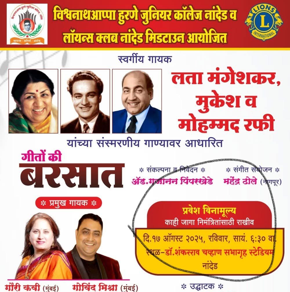 नांदेड शहरात सिनेमा सृष्टीतील गीतांची मेजवानी गेल्या काही वर्षापासून वाढली आहे त्यामुळे प्रेक्षक वर्गामध्ये संगीतमय कार्यक्रम पाहण्याची ओढ लागली असून आता सभागृहात गर्दी व्हायला लागली आहे परंतु या प्रेक्षकांसोबत दगाफटका झाला असल्याची दिसून येत आहे झाले असे विश्वनाथ आप्पा हूरणे ज्युनिअर कॉलेज नांदेड व लायन्स क्लब नांदेड मिटवून यांच्यातर्फे गीतों की बरसात या मथळ्याखाली लता मंगेशकर मुकेश व मोहम्मद रफी यांच्या गीतांचे सादरीकरण डॉक्टर शंकरराव चव्हाण सभागृह येथे दिनांक 17 ऑगस्ट रोजी सायंकाळी सहा वाजता आयोजित करण्यात आले होते आयोजकांनी समाज माध्यम तसेच वृत्तपत्रात मोठे जाहिराती देऊन सर्व प्रेक्षकांना आव्हान केले होते की या कार्यक्रमाचा लाभ घ्यावा यामध्ये प्रवेश विनामूल्य पण काही जागा निमंत्र्यासाठी राखीव असे प्रसिद्ध करून प्रेक्षकांना कार्यक्रमास यावे असे आवाहन केले कार्यक्रमाच्या दिवशी सायंकाळी अनेक प्रेक्षक वर्ग या ठिकाणी उपस्थित झाला. परंतु प्रवेश फक्त पाच धारकांनाच असल्यामुळे येथे उपस्थित असलेले कर्मचाऱ्यांनी पास धरणाचं आत् सोडले यामुळे बाहेर उभे असलेल्या जवळजवळ 100 ते 200 प्रेक्षकांनी मात्र संताप व्यक्त केला.
