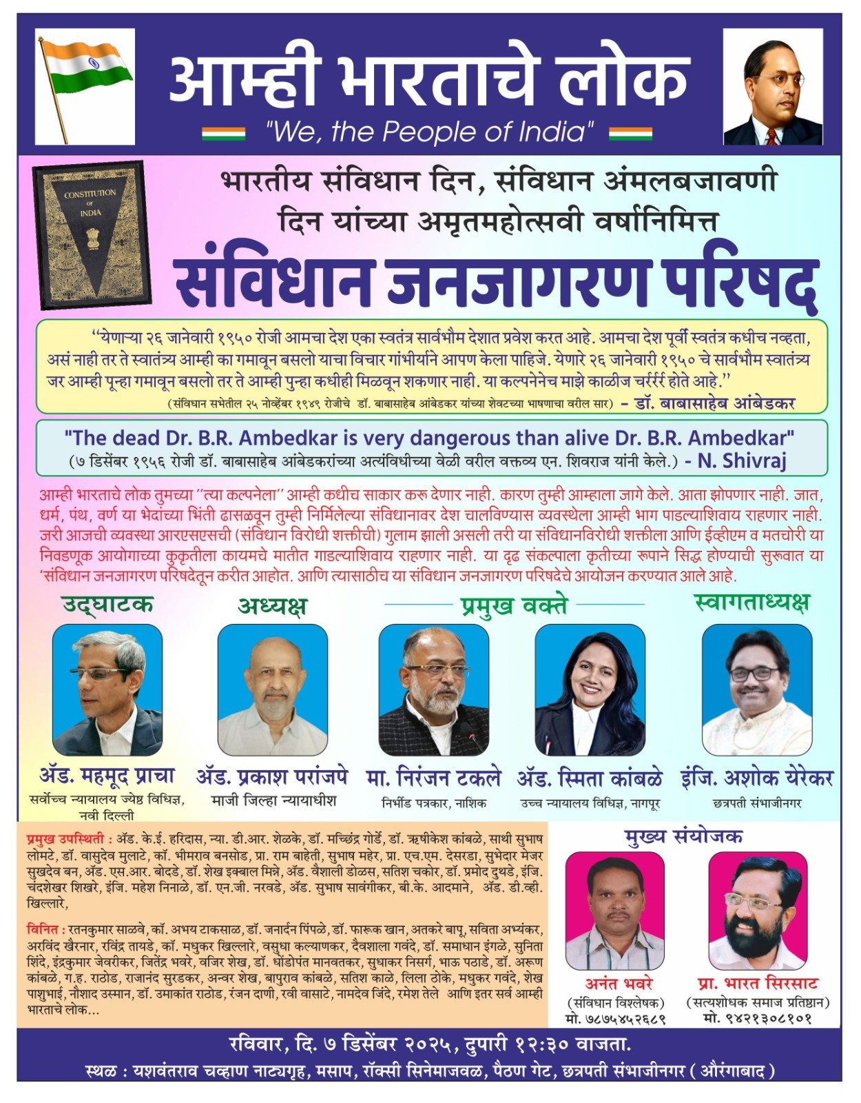 छ. संभाजीनगर / ‘आम्ही भारताचे लोक’च्या वतीने भारतीय संविधान दिन, संविधान अंमलबजावणी दिन यांच्या अमृतमहोत्सवी वर्षानिमित्त दि. ७ डिसेंबर २०२५ रोजी संविधान जनजागरण परिषदेचे आयोजन यशवंतराव चव्हाण नाट्यगृह, मसाप, रॉक्सी सिनेमाजवळ, पैठण गेट, छत्रपती संभाजीनगर (औरंगाबाद) येथे दुपारी १२:३० वाजता होणार आहे.