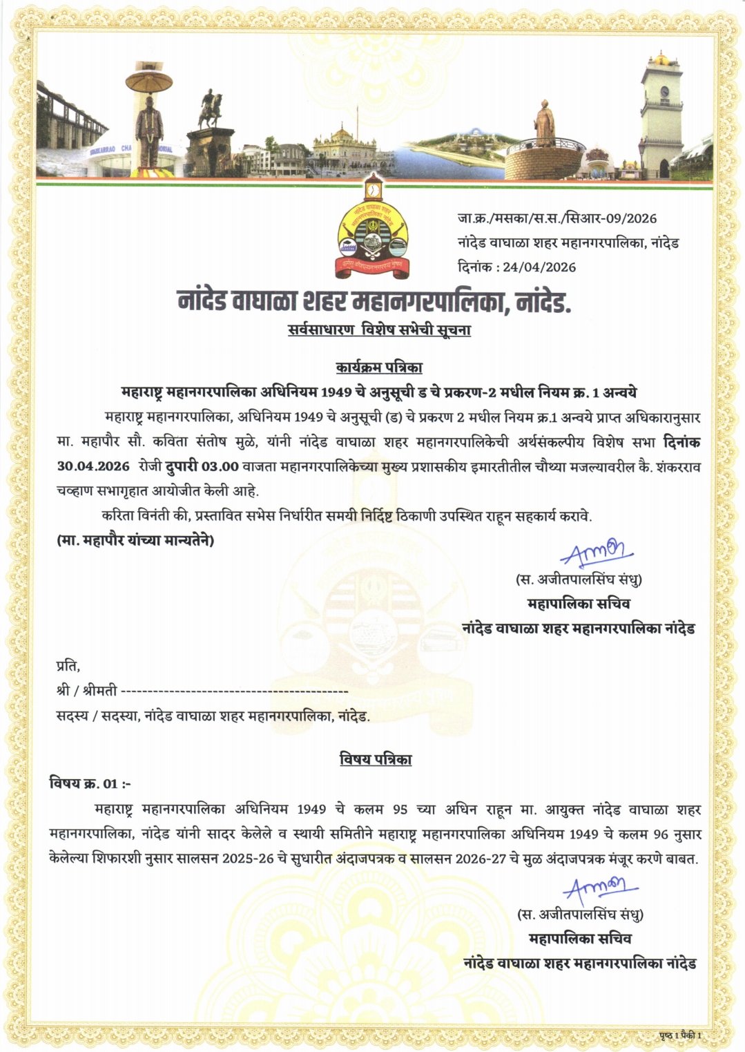 नांदेड वाघाळा महानगरपालिकेची अर्थसंकल्पीय सभा दिनांक 30 एप्रिल 2026 रोजी कै. शंकरराव चव्हाण सभागृहामध्ये दुपारी तीन वाजता आयोजित करण्यात आली आहे यामध्ये 2025 -26 चा अर्थसंकल्प मान्यता व 26 -27 ची अंमलबजावणीसाठी स्थायी समितीकडून आलेल्या प्रस्तावावर चर्चा करण्यासाठी व त्या अर्थसंकल्पाचा स्वीकार करण्यासाठी बैठक ठेवली असून या बैठकीपासून उपमहापौर दीपकसिंह राऊत यांना दूर ठेवण्याचे महापालिकेत बोलल्या जात आहे याबाबतीत सम्यक न्यूज ला मिळालेले माहितीनुसार दीपकसिंह हे रावत यांना व त्यांच्या सर्व ग्रुप सदस्यांना महापौर माहिती देत नसल्याची माहिती मिळाली आहे यावरून महापौर एकला चलो रे चा नारा देत चालत आहेत का असही आता बोलल्या जात आहे.